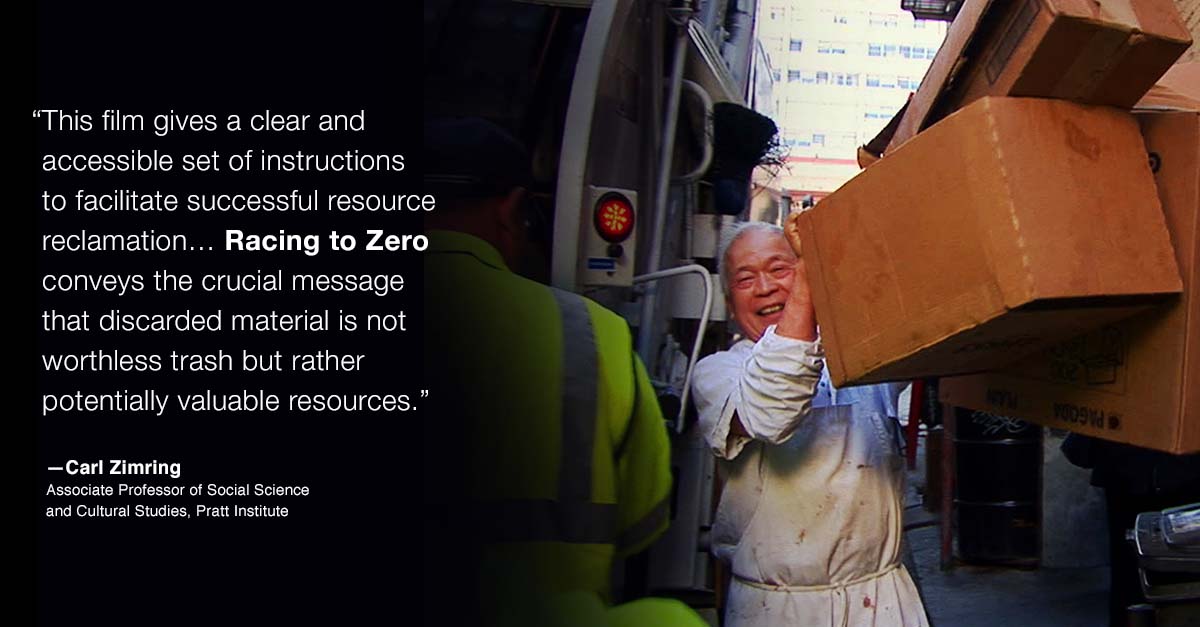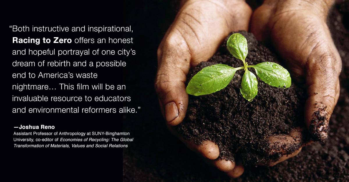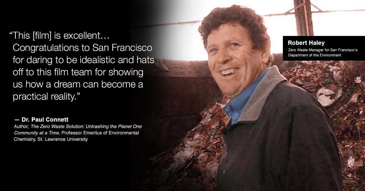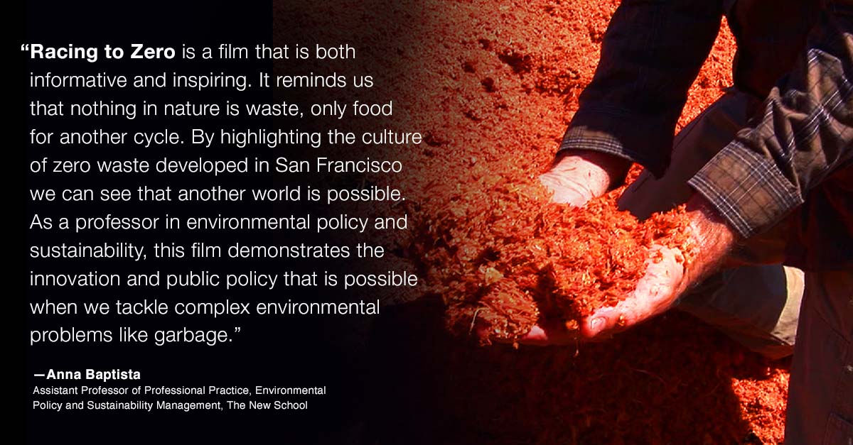 “For 20 years, San Francisco’s Department of the Environment has been working towards zero waste and now recycles, composts and reuses 80 percent of its garbage—but the race to eradicate trash continues, and this rousing film exhorts us to jin in. Follow along as the city’s food scraps are taken to Sonoma County farms , where they are composted into the rich soil that grows the crops that feed us all. Find out how glass bottle recycling stays local and forms a closed-loop cycle by addressing garbage at its source. Zero-waste experts show how far we’ve come in managing our resources, from medications and electronics to clothing and building materials. Even turning rubbish into art, these innovators zero in on new possibilities for greater sustainability.” — Summary by Carol Harada