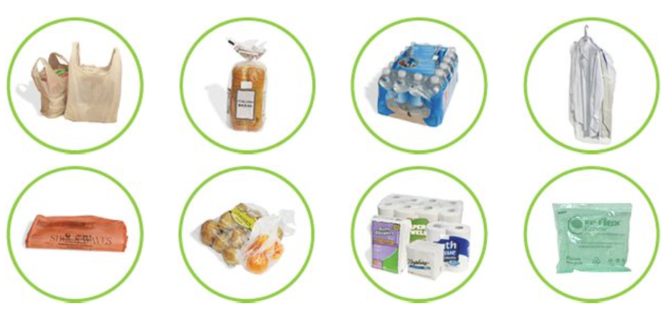 Grocery bags, bread bags, case overwrap, dry cleaning bags, newspaper sleeves, ice bags, wood pellet bags, ziplock and other re-sealable bags, produce bags, bubble wrap, salt bags, cereal bags, etc. All materials must be clean, dry and free of food residue to be recycled.